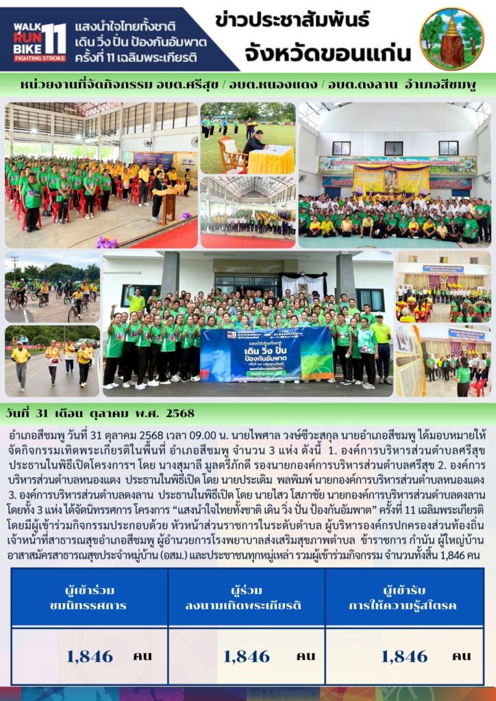 วันที่ 31 ตุลาคม 2568 พิธีเปิดโครงการแสงนำใจไทยทั้งชาติเดินวิ่งปั่นป้องกันอัมพาต ครั้งที่ 11 เฉลิมพระเกียรติ 31 ต.ค. 256831 ต.ค. 2025adminข่าวประชาสัมพันธ์
